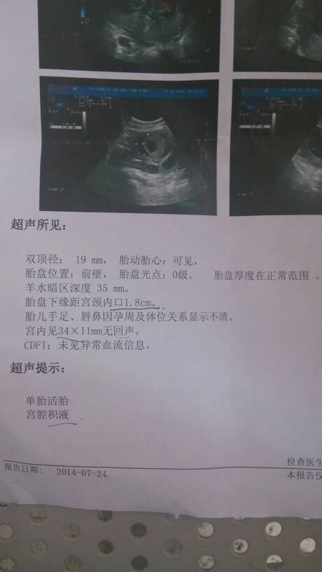 刚才今天突然腹下出血量少,马上去医院做了B超检查结果是把拍出来,让各位医生有什么意见谢了 刚才今天突然腹下出血量少,马上去医院做了B超检查结果是把拍出来,让各位医生有什么意见。谢了 点击展开 131*****937_OLUP 2014-07-24 17:16 为您推荐: 其他回答 你好,检查的结果显示宫腔有积液,胎盘位置低,需要注意休息保胎才行,尽量不要有性生活,如果有持续出血或者是腹痛需要服用药物保胎,保持好心情 专属于你8 2014-07-24 17:49 相关问题 有医生吗?我孕8周+6天了,一周之前见红,但出血量只有黄豆那么大,去医院做B超检查,医生说一切正常 怀孕12周,今天做B超未见心管搏动,医生让10后去复查,心里好怕,555,但好想说句现在医院真不负 今天去医院做B超、医生让我吃这个,还是免费的、要吃到肚子里的宝宝有三个月才不用在吃、