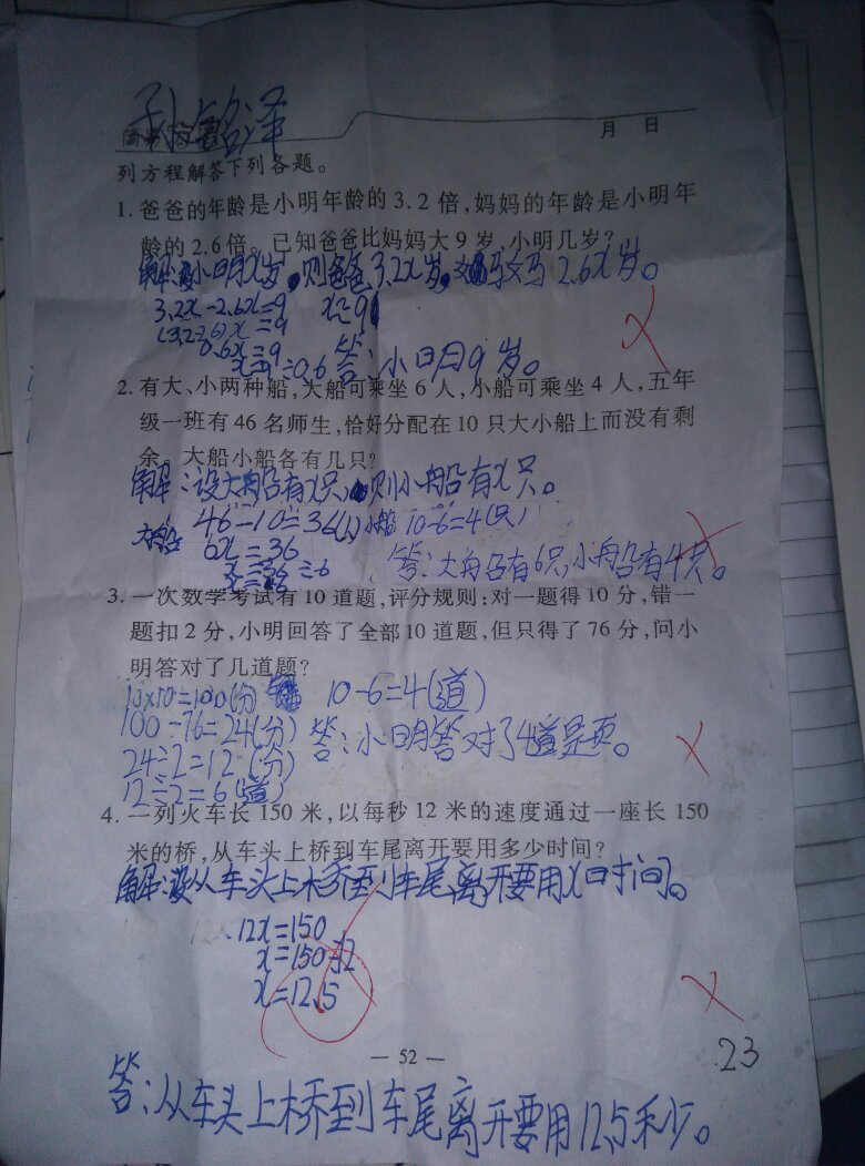 孩子四道题都做错了,请求高人帮忙解答,并解释说明一下2,3,题的解法 点击展开 匿名用户 2015-12-07 16:54 为您推荐: 其他回答 2、小船的数量:(6*10-46)÷(6-4)=7只 大船的数量10-7=3只 3、打错的题目:(10*10-76)÷(10+2)=2题 答对的题目=10-2=8题 匿名用户 2015-12-07 17:00 答对8道。8*10-4=76 匿名用户 2015-12-07 16:56 相关问题 有没有高人给解释解释??还有为什么ONTD风险值没有呢? 请高人解释医嘱写的什么,这是什么毛病 哺乳期,应如何治疗 客厅摆放着神位对面能挂宝宝的照片吗哪位高人能解释一下吗