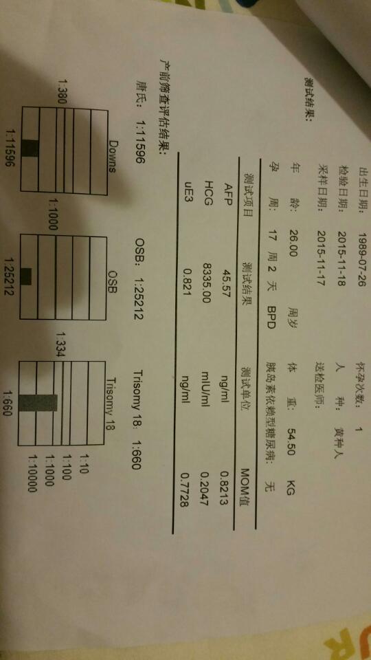 怀孕17周唐筛HCG测试结果8335.MOM值0.2047正常吗? 怀孕17周唐筛HCG测试结果8335.MOM值0.2047正常吗? 点击展开 划瞎你的双眼 2016-01-04 22:04 为您推荐: 其他回答 问医生吧! 🌚就叫小黑吧 2016-01-04 22:25 正常的。。 白色巧克力 2016-01-04 22:24 不清楚。。 小小宝贝乖 2016-01-04 22:24 不知道知道 眼镜控林小林 2016-01-04 22:18 去问问医生 小猴宝贝37 2016-01-04 22:13 加载更多 相关问题 我17周0天去查的唐筛,Free-hcg的MOM值是4 55,给的范围是0 5-2,AFP是正常的 试纸测试是阴性去医院做HCG4 9,孕酮17 22我到底是不是怀孕 医生您好 我老婆16周唐筛 查出开放性脊柱裂2 17 是什么个情况