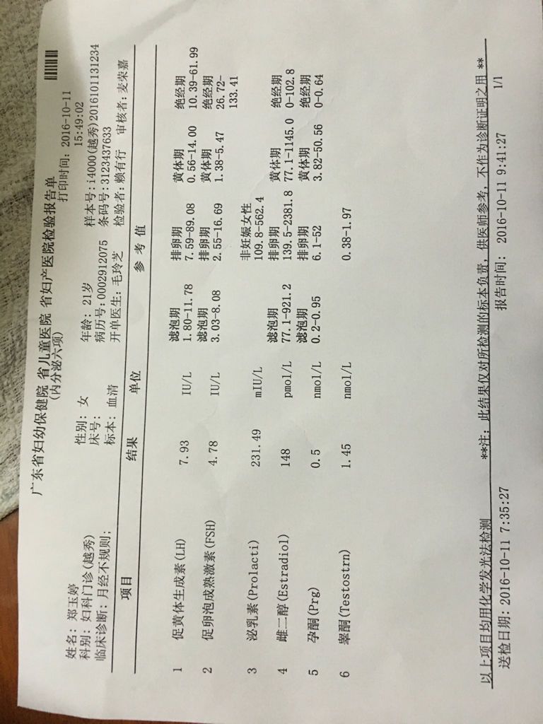 检查结果提示血LH(黄体生成素)/FSH(卵泡刺激素)>1,LH在卵泡早期升高会影响卵泡发育,使卵泡过早黄素化,导致排卵异常。需要进一步排除多囊卵巢综合征,PCOS是由女性生殖内分泌和代谢功能异常导致的排卵障乔旧碍性疾病,在生育年龄妇女中发病率为5% ~10%,在无排卵的不孕症患者中约占70%,目前发病率呈上升的趋势。PCOS的临床表导笼惑现为月经裕急稀发或闭经、不孕、多毛、痤疮、肥胖、脱发、黑棘皮症等。