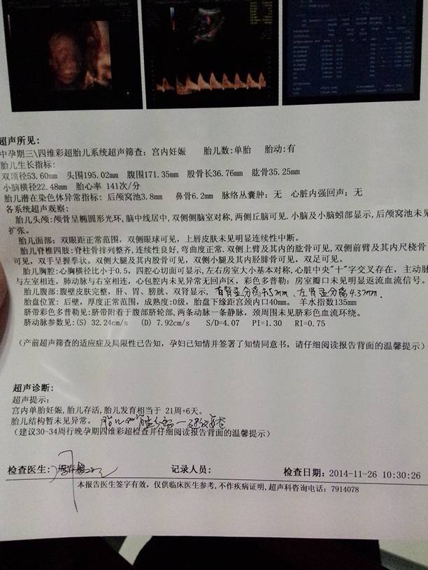 急急急,刚做完四维彩超说“胎儿双肾分离,有肾盂分离4.5mm,左肾盂分离4.32mm”请问这严重吗 急急急,刚做完四维彩超说“胎儿双肾分离,有肾盂分离4.5mm,左肾盂分离4.32mm”请问这严重吗?很担心 点击展开 吶傷、狠庝〆 2014-11-26 10:59 为您推荐: 其他回答 咨询一下医生,,, Loveャ甜心ミ宝贝♥ 2014-11-26 14:42 医生没说吗 150*****423_Ik9N 2014-11-26 12:52 要问医生啊 果果妈、 2014-11-26 12:18 那医生怎么说的呢! 微微一笑~很倾城 2014-11-26 11:49 医生怎么说的 用白色蜡笔画 2014-11-26 11:32 加载更多 相关问题 四维彩超显示左肾肾盂分离4 7mm,右肾肾盂分离3 9mm,双肾肾盂轻度分离,建议动态观察 急急急,刚做完四维彩超说“胎儿双肾分离,有肾盂分离4 5mm,左肾盂分离4 32mm”请问这严重吗 22周做的四维彩超,医生说胎儿双肾液暗区,肾盂分离(左侧分离5 4mm,右侧分离4 2mm)是什么意思啊!严重吗?该怎么做呢?