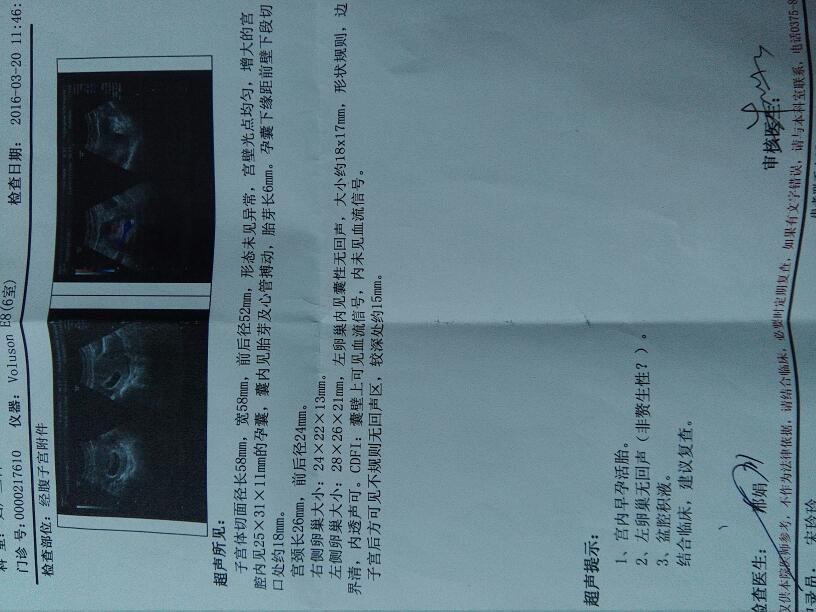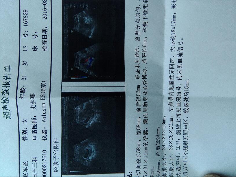 检查结告战果提示:宫内孕,胚胎发育正常出现了胚芽和胎心。一侧附件有炎症,宫腔积液。其它没有看到异常。建满兔套议你做个验血检卜亲查,看看孕酮是否正常。