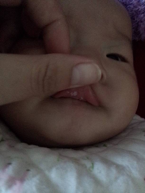 看起来有点像鹅口疮,注意之后口腔里其它地方有没有,先注意下宝宝口腔卫生吧,以后喂完奶后给宝宝喝点水当做漱口。可以的话买了碳酸氢钠液回来给宝宝涂在患处。不过鹅口疮比较容易复发。