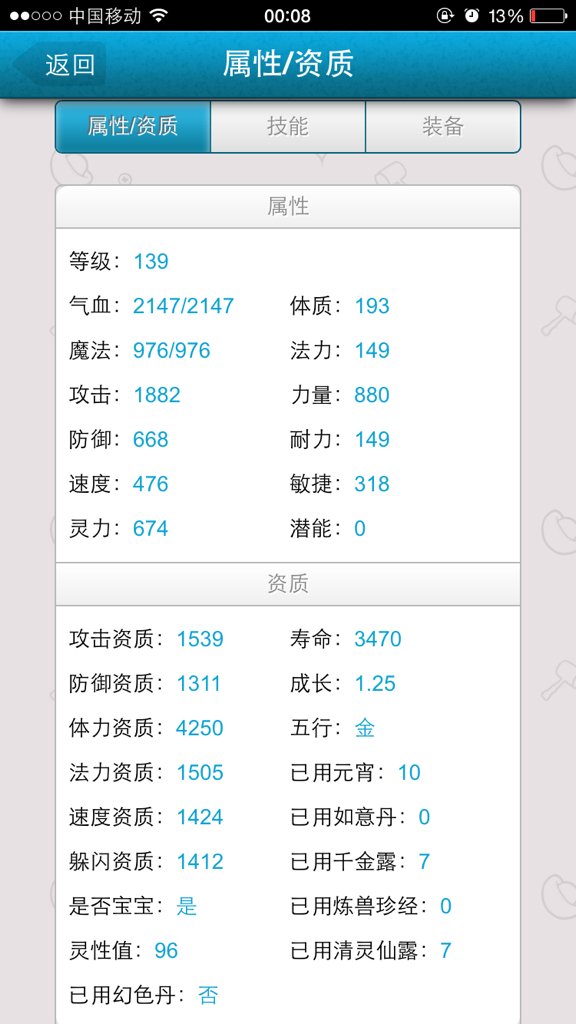 注意一下等级是139的,飞升等级带的宝宝,如果是109能带的可以泳索说是极品了,但是对于飞升等级带的宝宝来搁沙贸说这宝宝已经完全不够看了。129带的宝宝得有4000血,这个间葛差的太多了,而且只有3个内丹,完全不够看的。所以这个宝宝只是个红书的样子货,没有什么价值的。