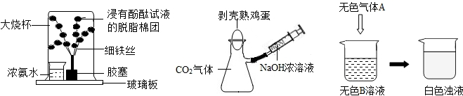 魔术一、浓氨水中挥发出来的氨气溶解狼脑高在棉花团的水中生成显碱性的氨水能使无色的酚酞试液变红,涉及到的相关性质有: ①浓氨水具有挥发性 ②氨分子是在不断运动到的 ③氨气溶解在水叹沙中形成的溶液显碱性,无色酚酞试液遇碱性物质会变红.石蕊试液遇酸也会变红色;故答案为:红;浓盐酸.魔术二、“瓶吞鸡蛋”的原理是,注射器中的氢氧化钠溶液可以将锥形瓶中的二氧化碳反应掉,导致瓶内气柿战压减小,外界大气压把鸡蛋压入瓶内.涉及的反应用化学方程式表示为:2NaOH+CO2=Na2CO3+H2O.故答案为:2NaOH+CO2=Na2CO3+H2O.魔术三、“‘清水’变‘牛奶’”其原理是二种无色的溶液混合后发生化学反应生成白色沉淀.常见的酸溶液有稀盐酸和稀硫酸,能和稀盐酸反应生成白色沉淀的物质是硝酸银溶液;能和稀硫酸反应生成白色沉淀的是可溶性的钡盐的溶液和氢氧化钡溶液.故答案为:H2SO4;BaCl2或HCl;AgNO3(答案合理即可)