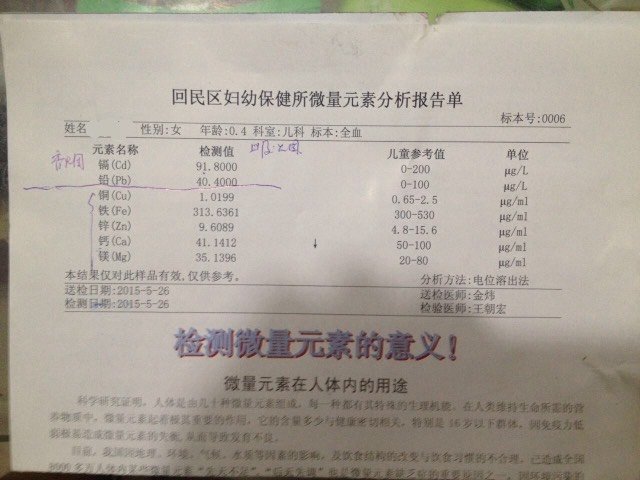 你好,你看后面的参考值没有超过的,铅元素 μg/L 0~100 汽车尾气、劣质的玩具家具油漆和墙漆、二手烟、电池、皮蛋、打印机油墨等含铅量很高,尽量少让宝宝接触这些东西