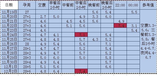 病情分析: 您好,妊娠期糖尿病的诊断标准是空腹血糖在5.1mmol以上,或者是餐后一小时在10.0mmol以上,或者是餐后2小时在8.6mmol以上,符合其中的二项可以诊断。 指导意见: 1.依据您所提供的数据来看目前还不能确诊,建议到医院的内分泌科进行诊断的,进行糖耐量实验,确定为妊娠期糖尿病也是...