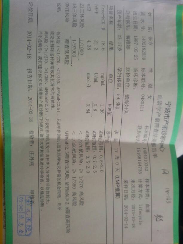 请问唐氏筛查中HAFP的MOM值偏低,这个问题大吗,已经预约了三维B超,得到4月中旬才轮到,这段时 间心里很担心啊,还有医生说21三体是1/1000风险也很大,这到底是高风险还是低风险啊?还有就是在怀孕前的两个月,老公有吃过一周治疗早泄的药,这个到底有没有问题,一直有疑惑?很担心 点击展开 张方0525 2014-03-09 17:00 为您推荐: 其他回答 结果均为低风险,不必紧张;按时做排畸超声即可。 蒉秋珊_68fP 2014-03-09 20:11 相关问题 唐式筛查hAFP值结果21 8U/mL 校正MOM值0 56,医院说结果偏低,这样有问题么? 请问下16周检查时 HAFP MOM值偏低 0 64,正常范围0 7—2 5,现在37周医生让我去遗传门诊咨询下,这个会有影响不? 医师说hAFP MOM值0 48偏低怎么办?没什么事吧