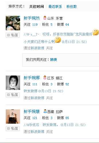 为什么新浪微博出现好多射手**的人 好奇怪,看样子也不是一个家族的 点击展开 匿名用户 2012-08-14 10:08 为您推荐: 其他回答 我也纳闷呢,粉丝里有好几个 ‘十八岁的XX+英文名’ 匿名用户 2012-08-15 08:35 相关问题 新浪微博打招呼,为什么有些我关注的人我点进了页面有那个对话框,有些我关注的就没有呢?好奇怪啊,求解 新浪微博上捐款一次后会有很多像僵尸粉一样的人@我捐款,很多都是白血病的小孩,是真实的吗 教你如何在宝树主页中加入新浪微博