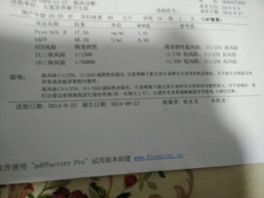 帮我看看这张报告单是什么意思,正常吗? 帮我看看这张报告单是什么意思,正常吗? 点击展开 ♂♂★向左转 2014-09-28 21:02 为您推荐: 其他回答 问医生呀, 可可麻咪 2014-09-29 11:30 这是张唐氏筛查的检查报告单,从你的结果看,三项筛查的结果均为低风险,表示危险性比较低,胎儿出现唐氏症的机会不到1%。属于正常的。 匿名用户 2014-09-29 09:02 医生没告诉你吗 我爱我男公♀ 2014-09-29 08:46 唐筛的结果,都是低分险,医生应该告诉你阿, 至少还有你ゞ 2014-09-28 22:42 都是地风险,很好 爱你宝贝儿2014 2014-09-28 21:24 加载更多 相关问题 帮我看看这张报告单显示的是怀孕了还是没有? 大家帮我看看现在宝宝有几斤,这张报告单是上个月四号做的 大家帮我看看现在宝宝有几斤,这张报告单是上个月四号做的