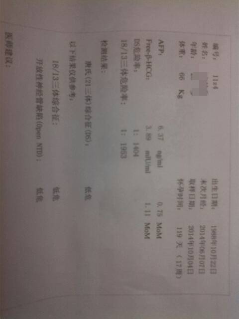 从唐氏筛查报告看,21-三体综合征、18/13三体综合征和开放性神经管缺陷都是低风险,说明胎儿患病的可能性小。建议暂时观察,定期产检。