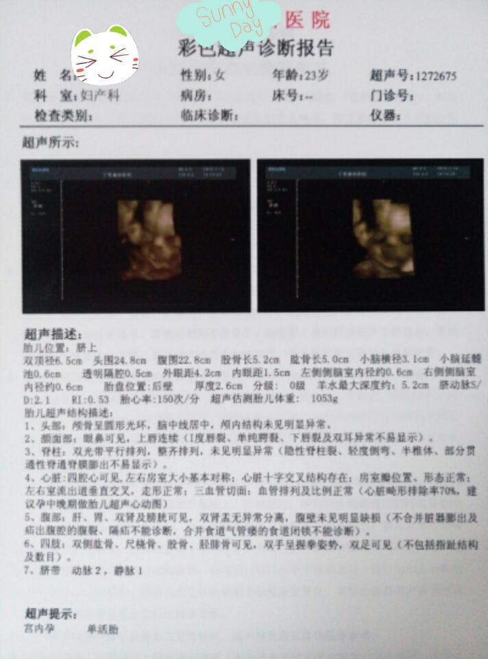 四维归来,一切安好 开始宝宝是坐着,而且坐的低,有些地方看不清楚,医生让出去走走 一个小时以后又 四维归来,一切安好。开始宝宝是坐着,而且坐的低,有些地方看不清楚,医生让出去走走。一个小时以后又去的,宝宝还好给力了一些,将将看到。 点击展开 煦宝麻麻 2016-02-16 18:46 为您推荐: 其他回答 祝宝宝健康 一一娘 2016-02-16 19:15 恭喜恭喜! 澜熙女神的麻麻 2016-02-16 19:06 恭喜宝妈! 木子_T5IO 2016-02-16 18:58 恭喜恭喜呀! 微笑糖 2016-02-16 18:52 。。。。。 小笨蛋!! 2016-02-16 18:50 加载更多 相关问题 今天去做四维累死了,宝宝懒,刚开始看不到脸,医生让出去走走,看看宝宝能不能翻身,结果我上楼下楼走了 昨天做四维B超没能拍到宝宝脸医生也没让我出去走走直接打印结果,这样对吗?没能看到脸部的情况下能看到 在家呆了一个星期了 想出去走走可以吗 我的孕酮很低医生说要卧床保胎 可是我老在家呆着都难受 我想出