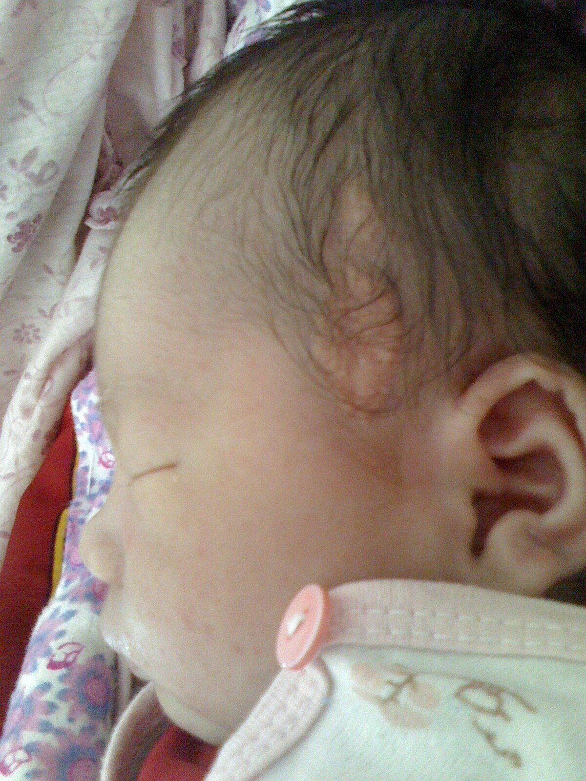 求助!我家宝宝出生时耳朵旁就有块胎记,表面颗粒状,突出了皮肤,比正常皮肤稍深,比刚出生的时候大了!
