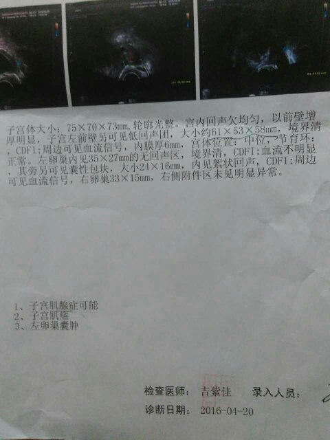 帮朋友问的,这是这两天做的检查单,子宫腺肌症,子宫肌瘤,卵巢囊肿,几乎妇科病一样不拉,想问一下医生 帮朋友问的,这是这两天做的检查单,子宫腺肌症,子宫肌瘤,卵巢囊肿,几乎妇科病一样不拉,想问一下医生,严重程度,能不能保守治疗,怎么用药,因为小孩考试在即,先用药物治疗,半年后再说,另外如果手术能不能保宫 点击展开 匿名用户 2016-04-21 19:43 推荐回答 前期还是晚期呈垃 最好还是尽快治疗 病症恨眠太多 保守治疗起不了太大作用 最好还是坐敲凡去医院做手术 身体最重要 匿名用户 2016-04-21 20:03 宝宝知道提示您:回答为网友贡献,仅供参考。 相关问题 子宫腺肌瘤子宫肌瘤卵巢囊肿 怀孕25周检查时发现有子宫肌瘤7 7*5 0我该怎么办?医生说可以生的时候一起剖腹产 子宫肌瘤做什么检查,46岁早上照了B超 医生要下班,爱理不理,没说