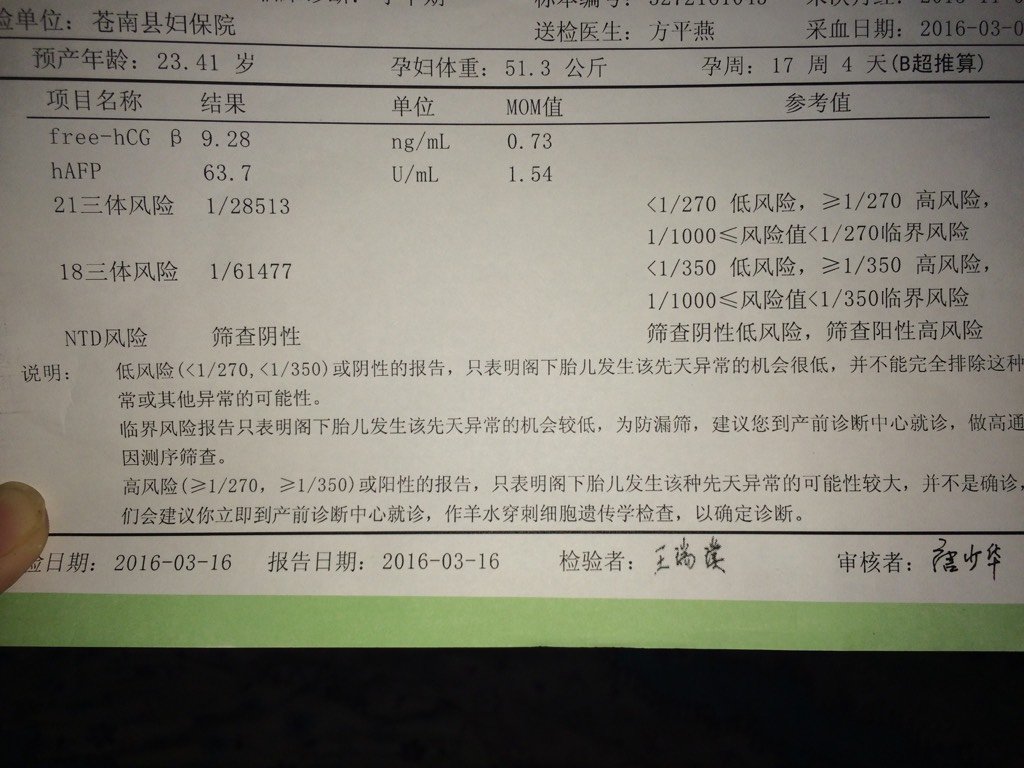 孕中期时候的唐筛报告单,通过数据看男女准吗?有宝妈会看的吗? 孕中期时候的唐筛报告单,通过数据看男女准吗?有宝妈会看的吗? 点击展开 再见,不见。 2016-05-06 22:41 为您推荐: 其他回答 不清楚,, 人无完人! 2016-05-06 22:54 不准的,, 猫猫丫头 2016-05-06 22:54 !!!!! 151*****766_Ih28 2016-05-06 22:52 不会看 健康就好 叶🍃子 2016-05-06 22:50 不会,,,,, 二货…… 2016-05-06 22:50 加载更多 相关问题 孕检唐筛报告单怎么看呢?我听说可以通过数据看出男女来,怎么看呀? 耶,今天去拿检验报告单,顺利通过,宝宝很好,心情不错,祝各位宝妈好孕 孕30周照彩超羊水指数204mm 还是偏多,怎么办?查了血糖都正常 医生们宝妈们看看我的报告单,给