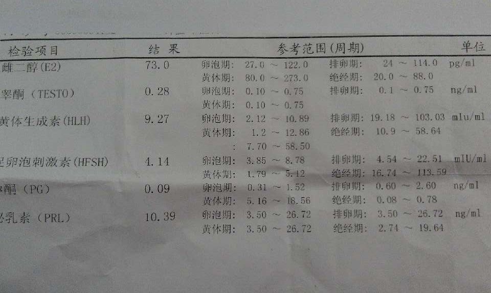 月经第三天检查激素六项孕酮偏低怎么办?大家帮我看看我该怎么办 点击展开 匿名用户 2013-04-25 10:11 为您推荐: 其他回答 月经干净第三天是卵泡期。后面有参考范围。你看是低了还是高了。 匿名用户 2014-06-12 18:21 说实话,。我也看不懂,我现在正为这个发愁。。 查静逸_ORDO 2013-04-27 16:15 相关问题 测激素六项,还要月经第三天,空腹去检查吗?为什么? 请医生帮我看看 5月15日来的月经,我怀孕50天,6月25日有走血,6月26日检查孕酮27 89 月经第二天去查了性激素六项,结果是孕酮低 要怎么办呢?