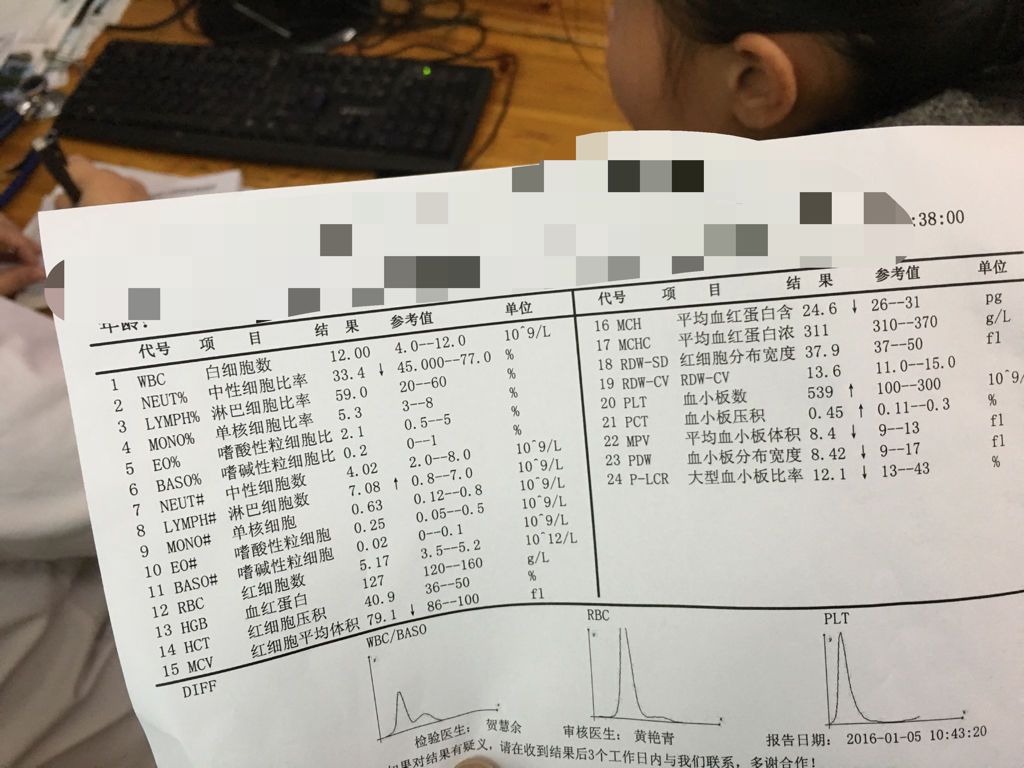 六个月宝宝血常规检测,帮忙看看有什么大问题?咳嗽十天,有点流鼻涕,血小板很高? 点击展开 匿名用户 2016-01-05 10:52 满意回答 你好,对于6个月的孩子来说,目前的血常规中除了血小板高,其他几乎正锅破厘常了哈。孩子出现咳嗽、流涕,可键惠能还是有呼吸道的一个感染,治疗后,症状逐渐缓解。血小板高,可以给剑吴孩子吃点双嘧达莫。 cn#BfLafVBQQu 2016-01-05 11:00 宝宝知道提示您:回答为网友贡献,仅供参考。 相关问题 我的血常规中血小板一直很高且治疗了这不过吃一段时间… 血常规两年做了两次正常,后一次的血小板比? 血常规两年做了两次正常,后一次的血小板比?