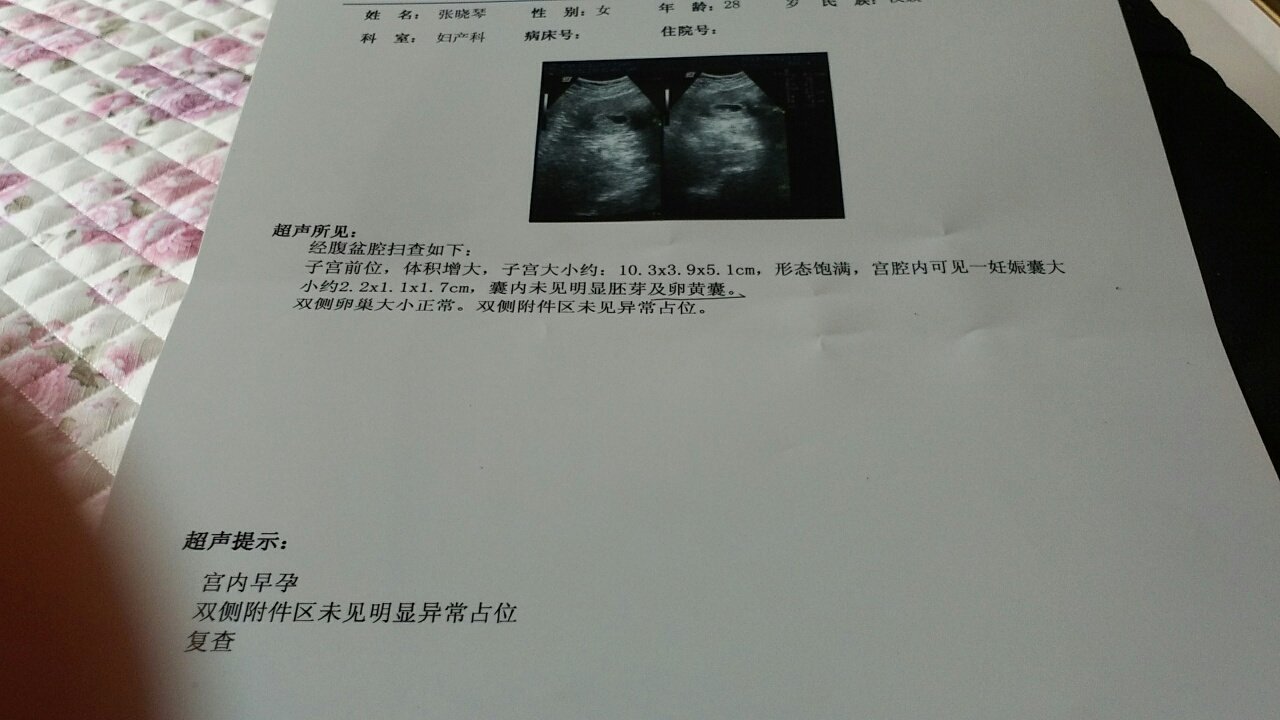 看自己末次月经的时间,看怀孕多久了,有怀孕的情况,但是没有看到卵黄囊,有没有胎芽,可以检查一下孕酮,HCG是否正常的。