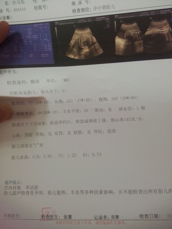 怀孕六个月为什么彩超没有说脚,手,腿啊,只有头肚子,大腿啊!大家可以看懂是男宝女宝么?求高人 点击展开 匿名用户 2015-02-11 21:28 为您推荐: 其他回答 B超单子上是不允许有有性别的信息透露的的,只有医生当时做的时候才能看到的一般不会说的。一般做的准确率在90%左右的。 2015-02-11 22:06 相关问题 照彩超时看到胎儿大腿腿之间有一个棒型物体,这是不是意味着怀的是男孩啊? 你好!请问我现在怀孕九周了,这两天肚子跟大腿的肉捏了都很痛!有什么问题吗! 怀孕34周,腰疼的厉害,怎么办?大腿根也疼,肚子的又下角也疼,可能是什么原因?怎么办?