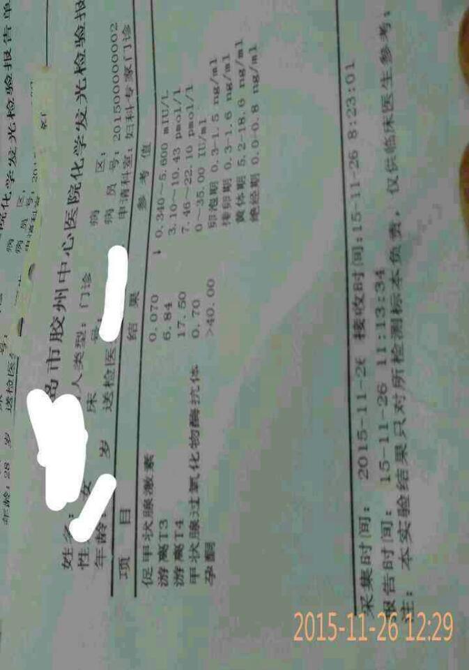 孕期促甲状腺0.07,游离 T3,T4正常,甲状腺过氧化物酶抗体也正常,怎么办 孕期促甲状腺0.07,游离 T3,T4正常,甲状腺过氧化物酶抗体也正常,怎么办 点击展开 可爱小马猴 2015-11-26 12:45 为您推荐: 其他回答 问问医生。 小星星✨star 2015-11-26 14:22 问问医生吧 半亩花田* 2015-11-26 14:16 去看看吧。。。 ____′夏沬 2015-11-26 14:13 问问医生。 余臭臭妈妈 2015-11-26 14:10 医生说什么了吗 冯纫机的麻麻、 2015-11-26 14:03 加载更多 相关问题 11周,甲功能三项里的TSH(促甲状腺激素)才0 008,游离T4、TPOA(抗甲状腺过氧化物酶抗体)均正常 TSH偏低对胎儿有影响吗? 游离T4,促甲状腺素,甲状腺过氧化物酶抗体,检查这些是干什么的 孕12周做的促甲状腺激素 3 42(0 3-2 5),偏高,游离甲状腺素T4 11 08(7 5-21 1),抗甲状腺过氧化物酶抗体 0 5(0-9)