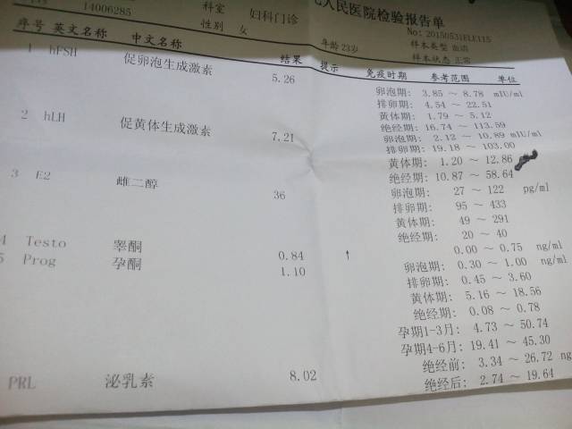 这是我月经第二天的化验单和彩超单,麻烦大夫们帮我看一下 这是我月经第二天的化验单和彩超单,麻烦大夫们帮我看一下。 点击展开 贝贝妞 2015-06-04 12:07 为您推荐: 其他回答 不客气,祝您和家人身体健康 linchuang0413 2015-06-04 17:45 从化验单上来看,影响不大 linchuang0413 2015-06-04 17:22 超声报告单显示子宫体积偏小,不考虑多囊卵 linchuang0413 2015-06-04 16:41 化验单显示睾酮值增高,建议你把超声单传个图片上来,看看是不是多囊卵 linchuang0413 2015-06-04 12:16 相关问题 麻烦大夫帮我好好看看、正常不、谢谢!月经周期和B 超单上、小两周 老婆做的唐氏筛查化验单,大夫请看一下有没有什么问题 大夫:6周岁小孩大便化验单帮看一下