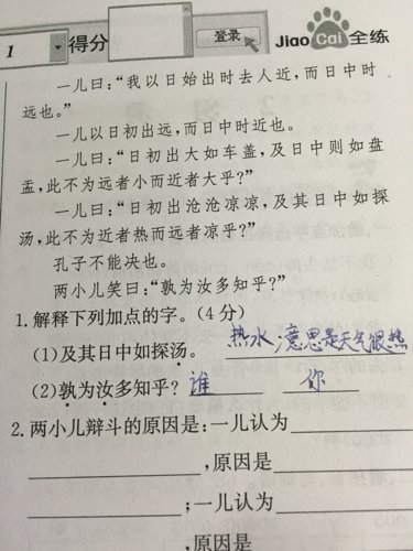 一儿认为太阳刚出时离人远中午时离人近,原因是太阳刚出来时很凉爽,而中午却很热,故而远的凉爽进而热的道理,一儿认为太阳刚出来时离人近,而中午离人远,原因是太阳刚出来时很大,而中午的时候很小,道理是,近的东西大,远处的东西小。