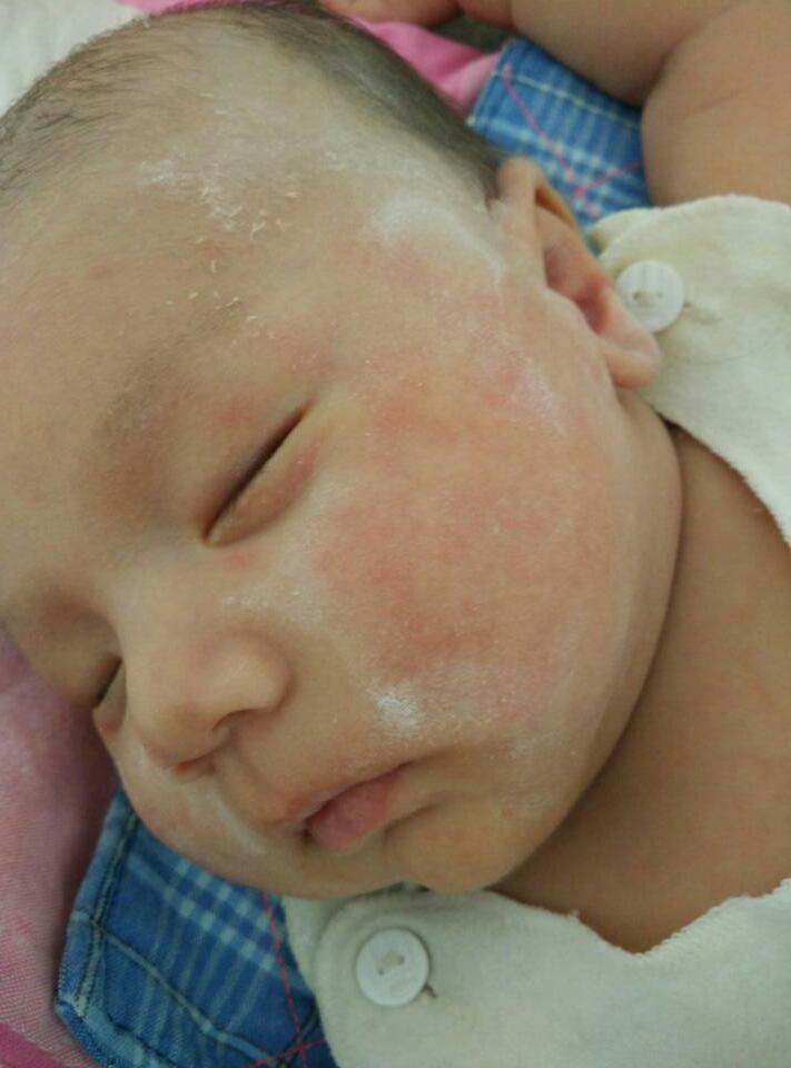 新生儿这是湿疹吗?最近两天张起来的,刚开始是特别密的小疙瘩不红,今天才大片红开越来越厉害!!心疼死