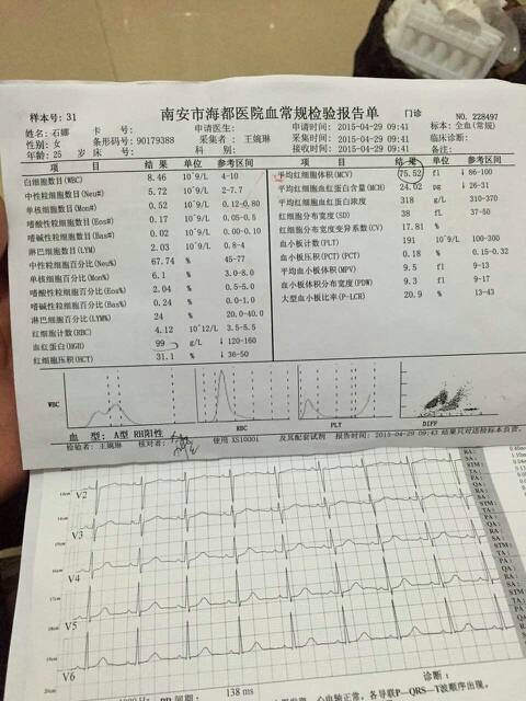 我姐昨天去检查,医生说怀疑她有地中海贫血,她现在怀孕7个来月,以下是她的检查报告,懂的帮忙看看 点击展开 匿名用户 2015-04-30 02:59 为您推荐: 其他回答 您好,目前的结果提示是小细胞低色素性贫血,也可以是缺铁引起的,建议进一步查铁蛋白相关检查明确,如果是的,补充铁剂就行。是不是地中海贫血可以再做一个红细胞脆性试验。 fufeng048 2015-04-30 08:15 相关问题 今天拿了贫血报告,医生说疑似地中海贫血哭了好一会 宝妈们帮忙看看,真的会是地中海贫血吗?几率有多高?今天又检查了,但是报告还要等几天才能拿!好担心! 今天做产筛医生说我有地中海贫血,有懂的看吗帮忙看下MCV平均红细胞体积79 4参考(82 0-95 这个是我做的四维彩超的报告单!可是我看不懂有没有在线的医生帮忙看看宝宝还好吗?