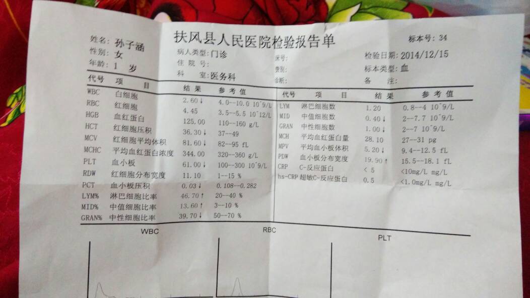 8个月宝宝血常规化验单,医生说的很含糊,宝贝上午发烧38.3给物理降温,吃了半包小快克,退烧了,下