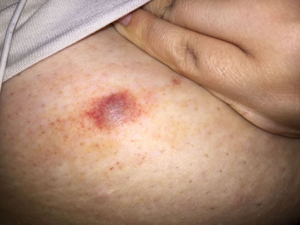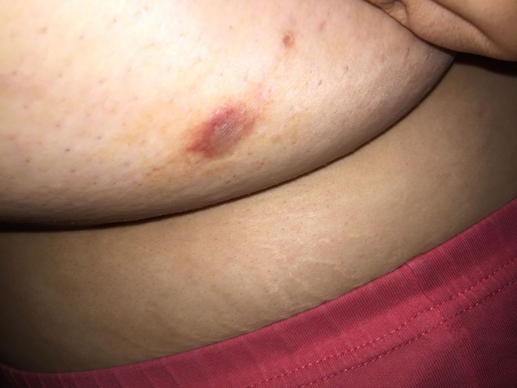 突然发现自己乳房上长了个脓包,紫色的中间部位 里面有浓,之前有毛囊炎 我想问这个是吗?刚开始有点痒