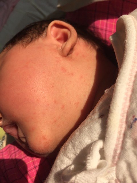 宝宝长这个有很多天了!有医生说是湿疹,也有说是感染的 擦过奶、红霉素软膏都没有效果,症状主要是早上