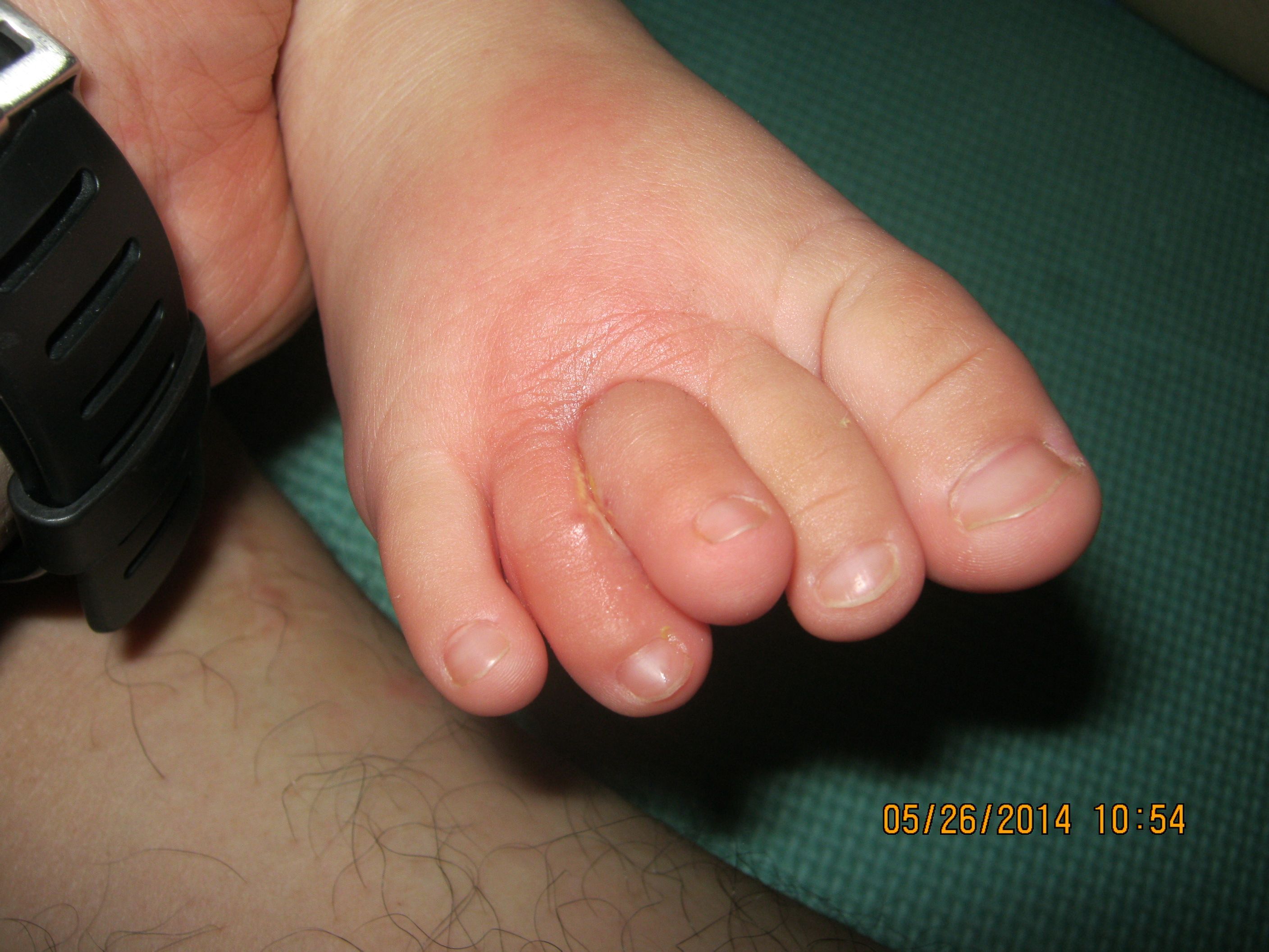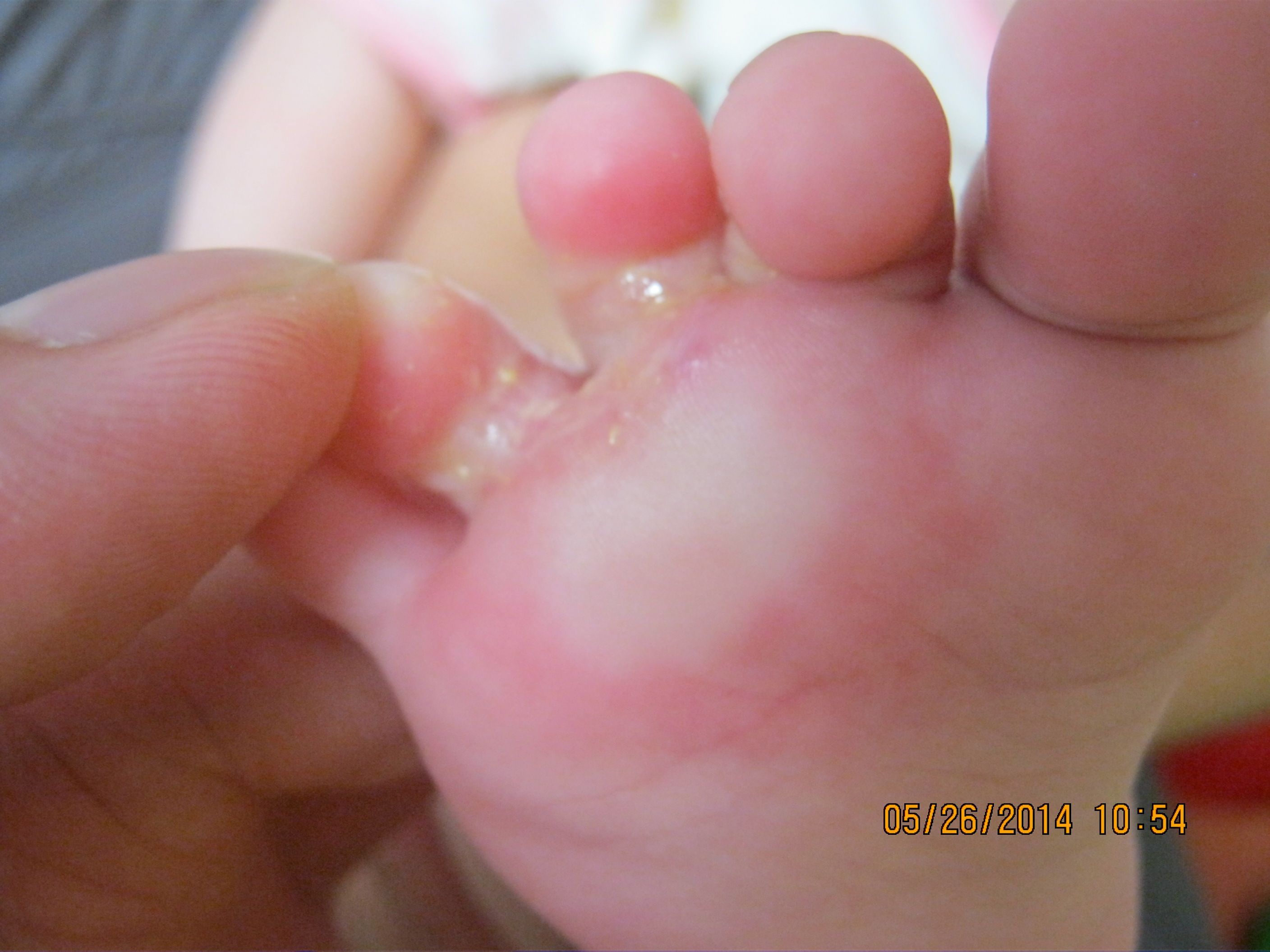 小孩10个月,脚趾夹缝脱皮发炎红肿,有说是湿疹,有说是细菌感染,买了药膏来涂,2天了还是没有消肿 点击展开 匿名用户 2014-05-26 11:38 为您推荐: 其他回答 感觉是感染了,宝宝有发烧吗? 陈长霞_PJHV 2014-05-26 13:15 相关问题 我的脚趾夹缝好痒,又脱皮又有水泡,怎么办?什么药膏好用呢? 哺乳期中的妈妈,脚趾头上生了湿疹,能用药吗,对宝宝喝奶有影响吗 现在宝宝一岁十个多月,他以前刚出生几天就长过湿疹,这次长得和以前不一样呢?开始是脚趾头上有两颗像蚊