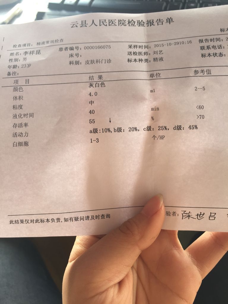帮忙看看这个单子精子活的有多少,能自己受孕吗? 点击展开 匿名用户 2015-10-29 22:23 满意回答 肯定还是有受孕可能的,精耻抓饥子之孟活率要求达50%(你的用局达到了),正常形态要达66-88%(结果中暂时没反应出来) cn#GfpkVaQau 2015-10-29 22:28 宝宝知道提示您:回答为网友贡献,仅供参考。 相关问题 精子a级19 84活率69 95有没有自然受孕的 精子活率81 88,a b41 33能正常受孕吗 衣服上有一点点精子的话放两天都死了吗?一点没活的了,就算进去阴道也无法受孕了