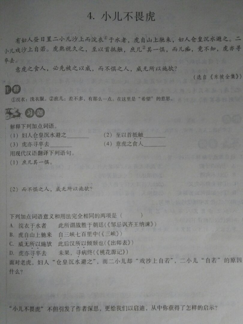 仓皇:匆促,慌忙; 抵触:碰触 ; 卒:最后录葛脚 ;意卜夕:料想,认为,猜测。 (老虎)希望他们会有一些害怕 然而(对于)不惧怕它的人,它的威力也就无处施展了啊 选d 都是“不久”的意思 小儿没见过老虎 也就不会惧怕它们 启示:初生牛犊不怕逼恨虎 无所畏惧才能勇往直前
