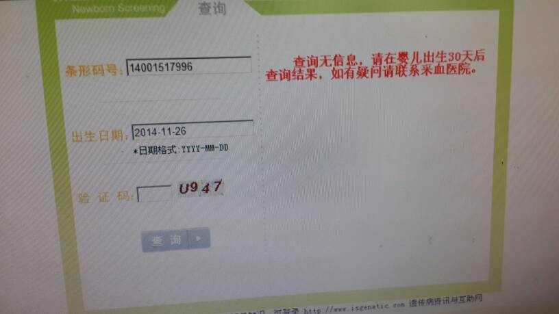新生儿疾病筛查查询卡,宝宝30天后,按照上面的指使查询,提示查询无信息,怎么回事?