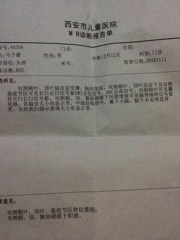 医生,您好!我家孩子出生因为难产造成了孩子脑缺氧,有积水,孩子两个月时在医院做了核磁共振,检查结果是有萎缩,附有照片 但截止到现在孩子不会主动那东西,胳膊有些紧拉不开,但靠着东西能坐住,请问医生孩子现 医生,您好!我家孩子出生因为难产造成了孩子脑缺氧,有积水,孩子两个月时在医院做了核磁共振,检查结果是有萎缩,附有照片。但截止到现在孩子不会主动那东西,胳膊有些紧拉不开,但靠着东西能坐住,请问医生孩子现在是什么情况? 点击展开 effie668 2016-04-26 10:18 为您推荐: 其他回答 没事情aa 斯瀚妈妈 2016-04-26 10:36 相关问题 我家女儿7个月早产,现在在重症看护已经快一个月了,核磁共振检查说脑缺氧 30周加6天做侧脑宽10mm,核磁共振结果是脑积水还有可能要吗 胎儿做核磁共振能检查出脑积水吗?如果32周检查没有,以后还会不会脑积水 现在侧脑室从9/7增宽到10 2/9了