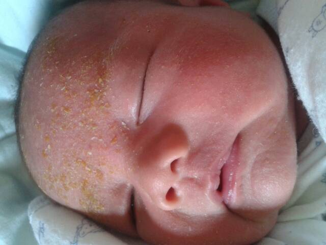 湿疹都结痂了、洗澡之后掉了、第二天就成黄色的了、脸蛋上还是红色的疙瘩、跪求帮助、这是怎么了?宝宝好