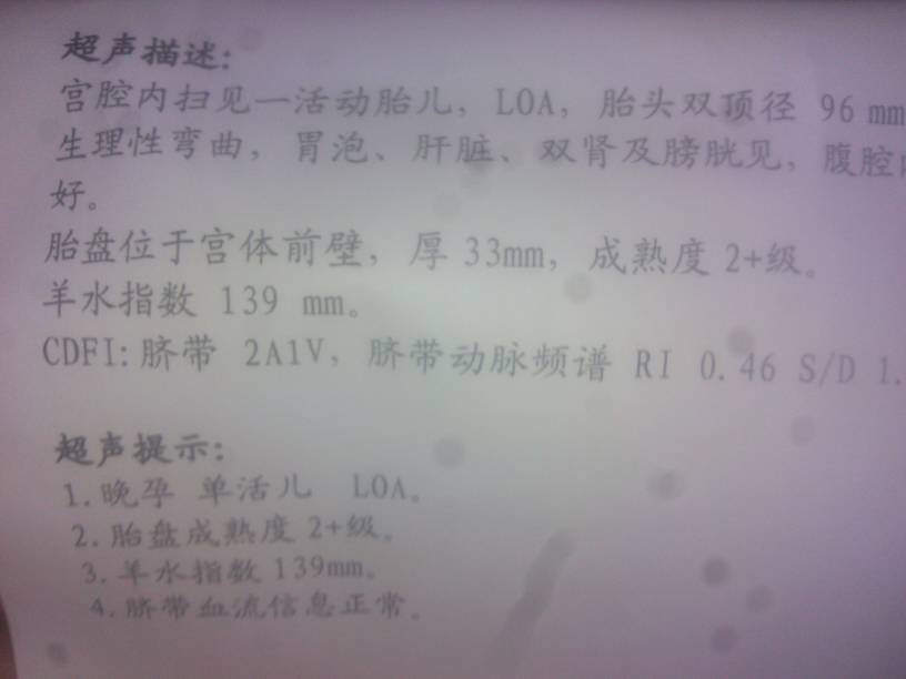这是今天去做的b超,医生只说正常,想问一下这里的医生,宝宝有多少斤?还绕脖吗?一切都正常吗?可不可 这是今天去做的b超,医生只说正常,想问一下这里的医生,宝宝有多少斤?还绕脖吗?一切都正常吗?可不可以顺产呢? 点击展开 ◤伊ω小默 2014-10-21 21:17 为您推荐: 其他回答 为金币打扰啦 爱宝宝。 2014-10-22 00:39 孩子的基本发育情况是比较好的,目前没有出现脐带绕颈的情况。。 群岛舟山 2014-10-21 23:50 应该有六斤左右 Amor°心若相依丶↓ 2014-10-21 21:56 不饶脖子了 來卟ij-.-學乖 2014-10-21 21:47 问医生啊。。。 侑旎懿滯菹 2014-10-21 21:46 加载更多 相关问题 今天做B超,宝宝已经23+4天了,医生说没有这么大,左右21左右大小,怎么回事啊? 怀孕36周时候做了B超双顶径8 9股骨长6 8,胎位:头位,医生叫我不需要要去产检了,这样宝宝有多
