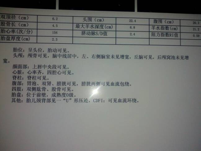 今天拍彩超,结果报告显示膀胱两侧可见血流包绕及胎儿颈背部见一U型压迹,CDFI:可见血流环绕,烦请 今天拍彩超,结果报告显示膀胱两侧可见血流包绕及胎儿颈背部见一U型压迹,CDFI:可见血流环绕,烦请帮忙确认下有无影响,非常感谢! 点击展开 昊~ 2014-07-17 20:17 满意回答 你好,这个就要看医生是怎殊叹么说的 只要多注意自己坊毫的睡觉朗剩近姿势,多休息,这样也许慢慢的就好 asdavx456s 2018-01-15 12:46 宝宝知道提示您:回答为网友贡献,仅供参考。 相关问题 可不可以解释下四维彩超单 第一个问题{颈部:见U压痕,CDFI见环绕颈部脐带血流}这是什么意思? 孕6周,彩超结果:CDFI:孕囊内可见胎心血流信号 是什么意思?? 胎儿左下腹(膀胱左侧)见一低回声区21*16*20,内见团状稍强回声16*8*16,CDFI扫查未见明显血流信号