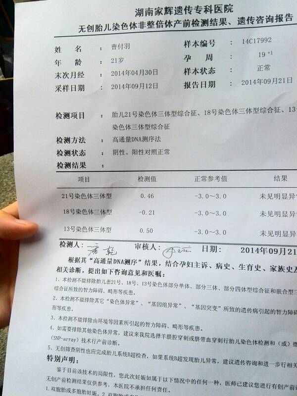 有没有医生帮忙看看这个无创报告宝宝有问题吗 有没有医生帮忙看看这个无创报告宝宝有问题吗 点击展开 😊😊 2014-09-30 17:17 为您推荐: 其他回答 宝妈,无创是个什么检查啊 133*****264 2014-10-04 22:44 ?。。。。。。 爱老公爱宝宝 2014-10-04 14:01 您的检查报告中每一项后面都明确表示未见明显异常,那就是说都是正常的,没有问题 衷喜明2 2014-10-02 09:50 我的是一本书。你的怎么一张纸??? 爱轩宝宝 2014-10-01 11:40 没问题,,都正常 爱你BB 2014-10-01 08:28 加载更多 相关问题 请帮我看看我的唐氏筛查报告有没有问题,为什么医生叫我做产前无创测试,也是抽血,要2000多,不知道 急急急…路过医院拿了报告…可医生都下班了,帮忙看看有问题不??