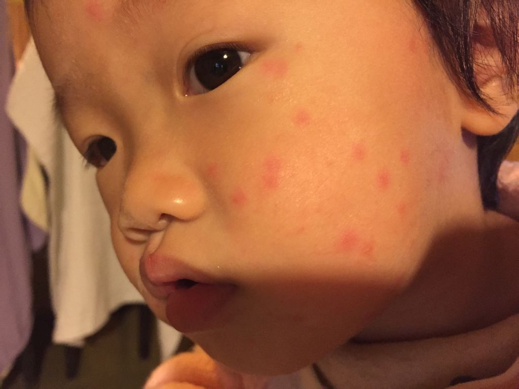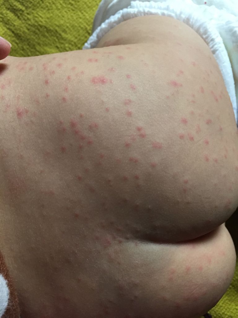 宝宝国庆节得了病毒性感冒,2周左右好了,三天前也就是10月第四周突然晚上低烧到38.2度,一晚物理降温,第二天没烧了,到今天第四天,基本都是正常体温36.3-36.5,但是从第二天退烧后,开始出红疹子,先从背,肚子,再到腿,手背,今天是脸和脖子,但嘴巴里,头发里,肛周都没有,红疹子是一个一个的,分布均匀,密密麻麻的,好像不痒也不疼,因为她没有抓挠,我摸红疹的尖,很少量的尖尖上有水泡,但都很轻微,具体情况看图,快帮帮我!到底是什么?寻麻疹?水痘?好是退烧红疹?