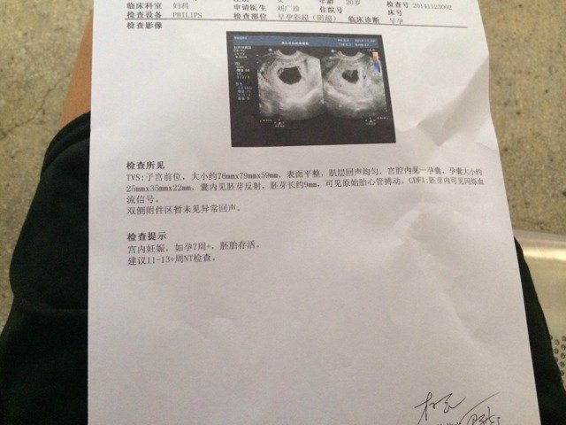 你好,从这个超声检查结果报告单上可以看出,孕囊像核桃那么大了,胎宝宝还很小呢,才9mm,就是9毫米,还不到1厘米呢,也就跟一粒比较小的花生米似的吧。建议定期去医院复查,适当加强营养,注意食物的多样化和营养化,多吃新鲜的绿叶蔬菜,适当多吃一些坚果。