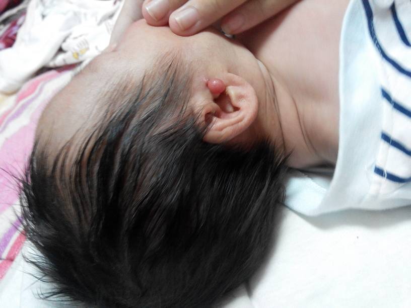 宝宝出生时耳朵边长了个小肉球 一个多月了一直那样 今天肿了是怎么回事 求个医生解答 在医院的时候