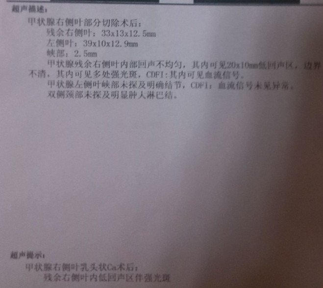 是癌。没转移。但需要再次手术切除右侧甲状腺。