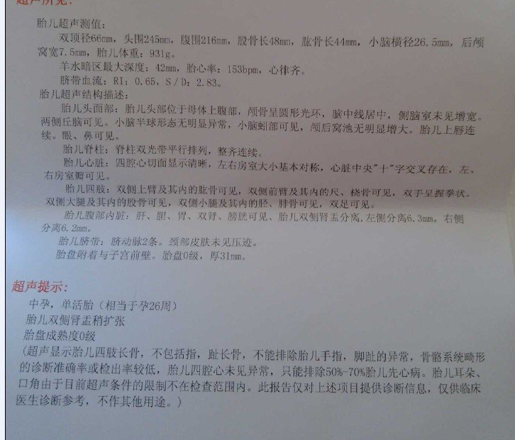 病情分析: 你好,胎儿双顶径66mm相当于怀孕27周减,腹围216mm相当于怀孕26周减,头围245mm相当于怀孕26周加,股骨长48mm相当于怀孕26周。 指导意见: 根据B超结果看,胎儿发育正常,孕26周左右,胎心,胎盘,羊水,脐动脉血流S/D都在正常范围内,肾盂分离不超过10mm为正常,无需治...