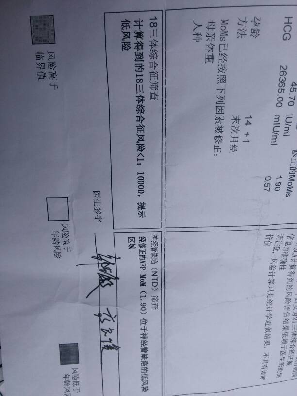 你好,唐氏综合症的检查结果是结合你的年龄的,所以你也不需要担心的太多,只要是属于低风险的话,那么一般就会没事的。