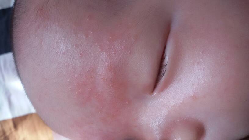 湿疹,宝宝很痒的,抱着他,会往你身上直蹭。。得擦药膏
