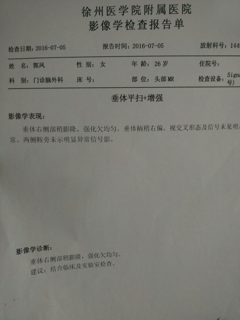 月经三个月没来!做的性激素检查泌乳素高107然后做的磁共振!怀疑有微腺瘤!建议增强!