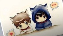 求一张图、两个漫画小孩都有猫耳朵趴在一起、一个戴了深蓝色披风斗篷、一个穿了一身白色戴了一个猫铃铛