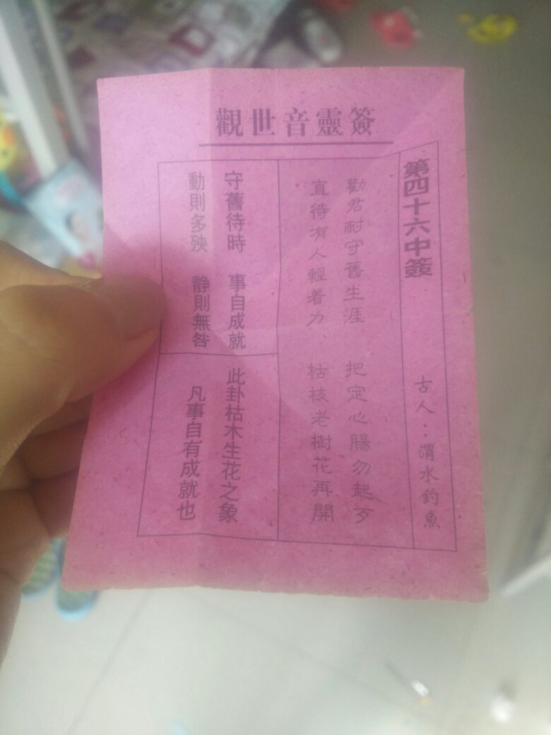 和男盆友已经分手一个多星期了。他很自私,很不珍惜我。连怀孕去打胎都没有陪我去。而是去上网。这个去年夏天在厦门的土地庙求的。分手后太失望了所以烧掉了。 求大师帮我分析一下。符烧掉了会不会不好?我今后要怎么办?拜托大家了,我现在真的好需要这个答案。 观世音灵签 第四十六中签 古人:渭水钓鱼 劝君耐守旧生涯 直待有人轻着力 把定心肠勿起歹 枯枝老树花再开 守旧待时 事自成就 动则多殃 静则无咎 此卦枯木生花之象 凡事自有成就也